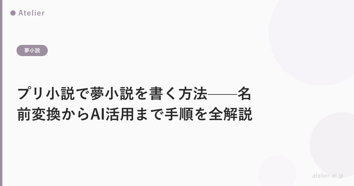 夢小説の書き方全般については夢小説の書き方完全ガイド、ストーリーのアイデアが欲しいときは夢小説のネタ一覧50選も参考にしてみてください。